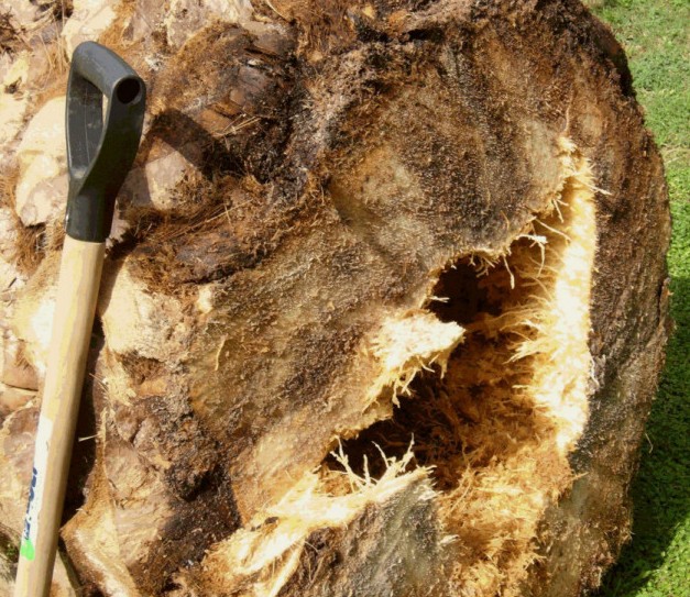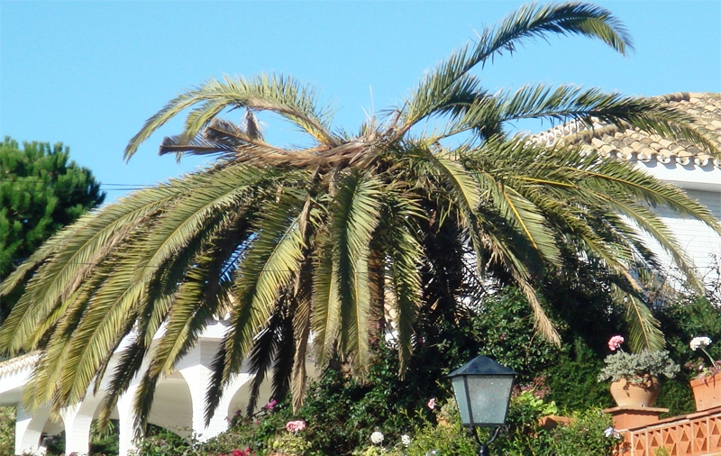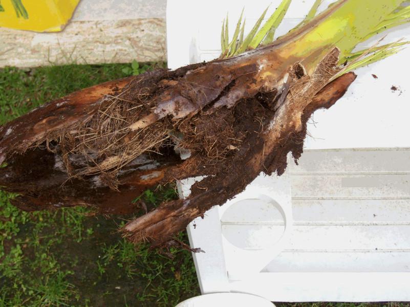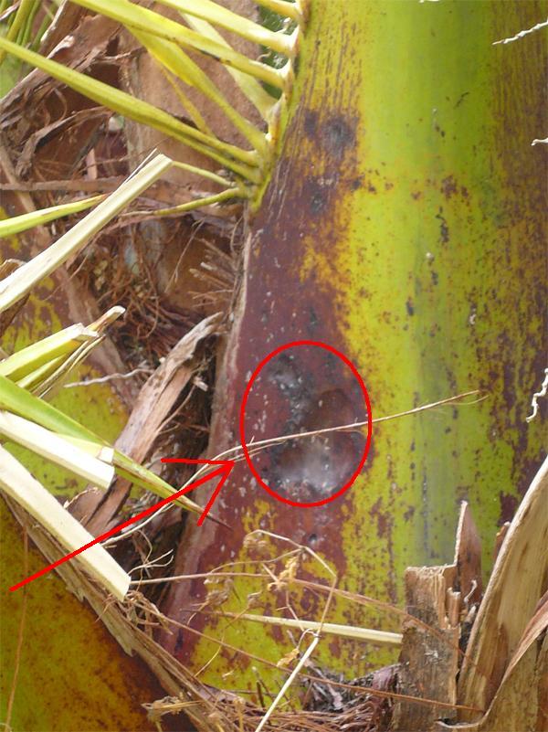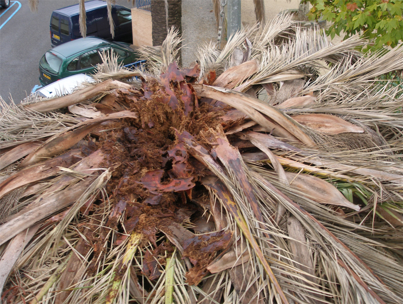 Le giovani foglie centrali sono le prime a morire e marcire mentre le restanti, prima della morte della pianta, fanno assumere alla chioma il caratteristico aspetto ad ombrello aperto, a causa delle lesioni provocate alla base dei piccioli fogliari. Quando la palma assume tale forma è già completamente compromessa ed in poco tempo si avrà il disseccamento totale, con collasso, cedimento del rachide e caduta delle foglie. (…) La gestione delle infestazioni del Rincoforo è disciplinata dal Decreto del 9 novembre 2007 circa le “Disposizioni sulla lotta obbligatoria contro il Punteruolo rosso della palma Rhynchophorus ferrugineus Oliver” (G.U. n. 37 del 13.09.2008).
