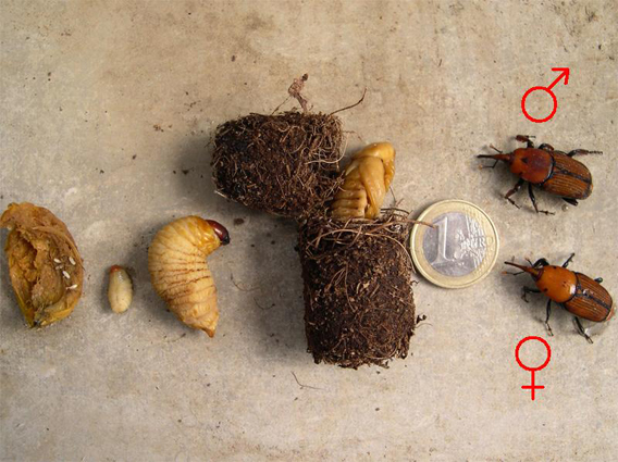 Successivamente segue la fase di richiamo che viene captata dagli altri individui, adesso femmine, dando vita alle fasi di accoppiamento. Segue la deposizione delle uova (200-300 per ogni femmina) ad una profondità di circa 3-4 millimetri, da queste escono le larve che cominciano a scavare la pianta fino ad interessare tutta la regione della corona fogliare. Crescendo, si muovono verso il centro dello stipite della palma dove scavano tunnel che confluiscono in larghe cavità. Una volta mature, si preparano un riparo ellittico costituito dalle fibre interne o fogliari. Dopo 14-21 giorni fuoriescono gli adulti.