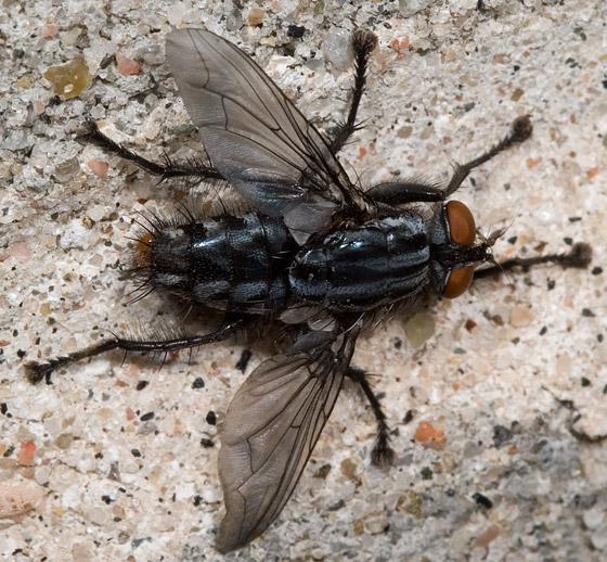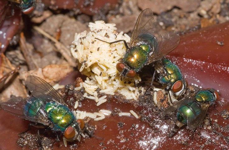 Mosconi di grossa taglia e appartenenti al genere Calliphoridae, verranno trattate tutte insieme per via delle molte somiglianze. Spesso dotate di colori metallici e dal volo rumoroso e veloce, sono rinvenibili facilmente nei pressi di pescherie, mattatoi, discariche, ecc. Prediligono per l’ovodeposizione carne molto frolla, sentono infatti l’odore di cadavere da diversi km e solo in mancanza di questi, depongono ma sempre in maniera limitata su escrementi e altro materiale in decomposizione.