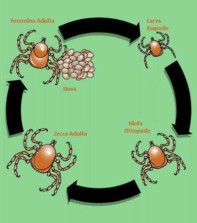 Le zecche sono ectoparassiti ematofagi dei vertebrati, appartengono alla Classe Arachnida, Ordine Acarina. (…)Delle varie famiglie di zecche, che comprendono oltre 870 specie, due hanno importanza per l’Italia, Argasidae e Ixodidae. Le prime vengono definite “zecche molli” in quanto non presentano in nessuno stadio di sviluppo lo scudo dorsale chitinoso; nelle Ixodidi dette “zecche dure” lo scudo chitinoso ricopre interamente il dorso del maschio e nelle femmine è presente solo anteriormente. Fra le specie prevalenti in ambito urbano e che presentano maggiori possibilità di “contatto” con l’uomo vi sono Argas reflexus, Rhipicephalus sanguineus e Ixodes ricinus.