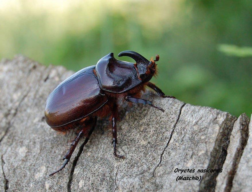 Talvolta scambiato per scarafaggio ma appartenente all’ordine dei Coleotteri e alla famiglia degli Scarabeidi, era prima molto presente nelle nostre campagne. I maschi sono dotati di un vistoso corno cefalico rivolto all’indietro, caratteristica che è valso a questi insetti il nome comune di scarabeo rinoceronte. Dalle abitudini crepuscolari e notturne, ha un volo poco preciso e pesante, infatti, spesso sbatte rumorosamente sui muri cadendo rovinosamente per terra. Gli adulti non si nutrono, consumando durante le poche settimane di vita adulta le riserve accumulate nel corso degli stadi larvali. Essendo un coleottero dovrebbe essere considerato un portafortuna piuttosto che provocare ribrezzo.