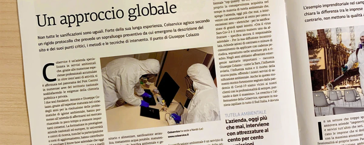 «Ora il virus Sars-Cov-2 è il nemico numero uno da affrontare. – specifica ancora il responsabile aziendale - Per la sua diffusione incontrollata, richiede azioni di contrasto e misure di contenimento da applicare con cadenza periodica, soprattutto nelle strutture più a rischio. Negli anni abbiamo affrontato emergenze sanitarie importanti – racconta Giuseppe Colazzo – come la Sars, l’influenza aviaria, l’influenza suina e il morbo della mucca pazza, offrendo i nostri servizi di sanificazione ambientale. Anche in questo momento storico fortemente segnato dalla pandemia di Covid-19 siamo vicini ai nostri clienti con la professionalità di sempre, puntando a dare il massimo». La crescita e l’affermazione della Colservice, operante in maniera capillare in tutto il Sud Italia, è dovuta ad un impegno costante e di squadra. Colservice agisce in un’ottica di altissima professionalità e trasparenza, fornendo al cliente un quadro chiaro e dettagliato della situazione presente, attraverso un sopralluogo preventivo da cui emerge la descrizione del sito e dei suoi punti critici, i metodi e le tecniche di intervento. «Crediamo fortemente nel nostro lavoro che svolgiamo da sempre con grande entusiasmo perché come citava Henry Ford “L’entusiasmo è alla base di tutti i progressi”».